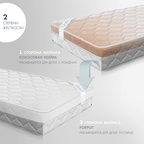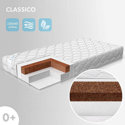 Детский матрас Nuovita Classico. Максимальная нагрузка на матрас 30 кг. Состав наполнителя: Forplit 6 см + кокос 6 см + спанбонд. Жесткость матраса "средняя". Чехол матраса съёмный, выполнен из стеганного трикотажного полотна.