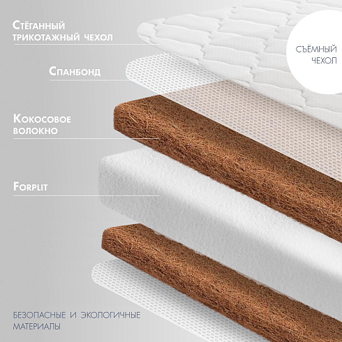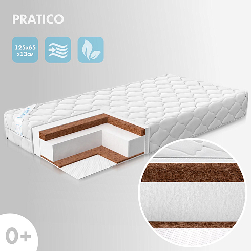 Детский матрас Nuovita Pratico. Максимальная нагрузка на матрас 30 кг. Состав наполнителя: кокос 1 см + Forplit 8 см + кокос 3 см + спанбонд. Жесткость матраса "средняя". Чехол матраса съёмный, выполнен из стеганного трикотажного полотна.