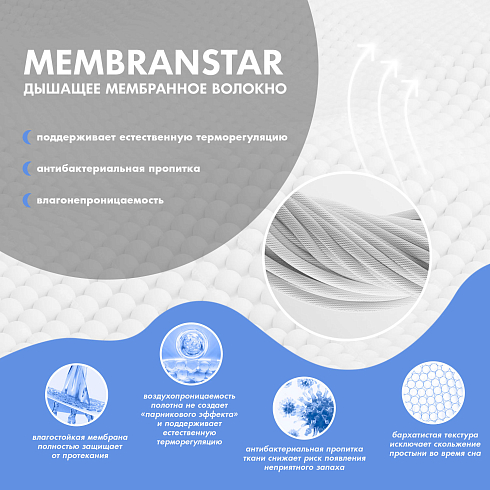 Данная модель изготовлена из инновационного материала Membranstar (технология итальянской марки Stellini). Бархатистая текстура материала исключает скольжение простыни во время сна.