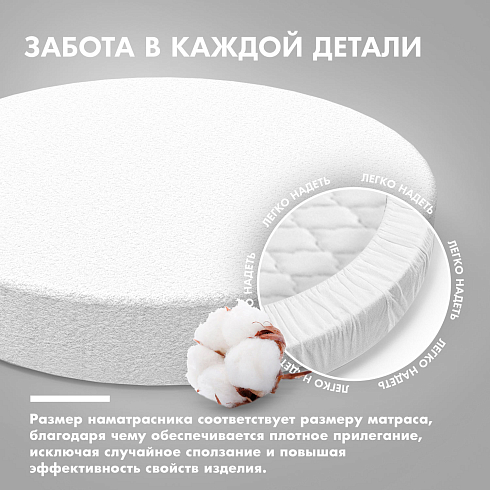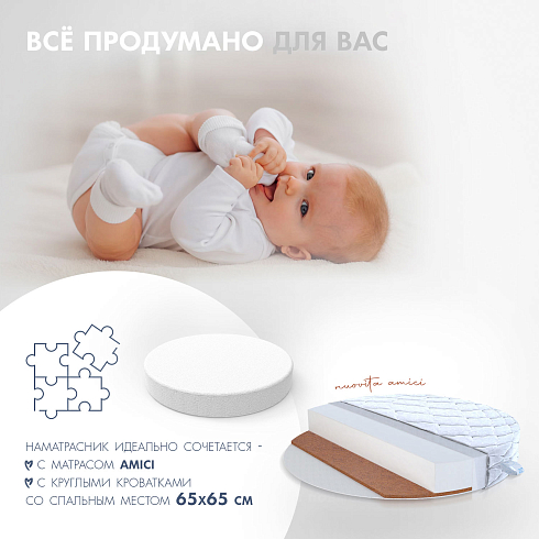 Модели для круглых и овальных кроваток изготовлены с резинкой по всему периметру. Для прямоугольных кроваток предусмотрены резинки по углам. Размеры чехла-наматрасника Nuovita максимально соответствует параметру матраса, что способствует прочной фиксации и исключает случайное сползание.