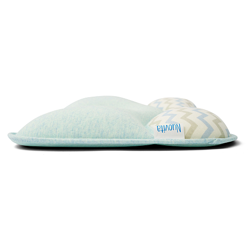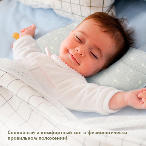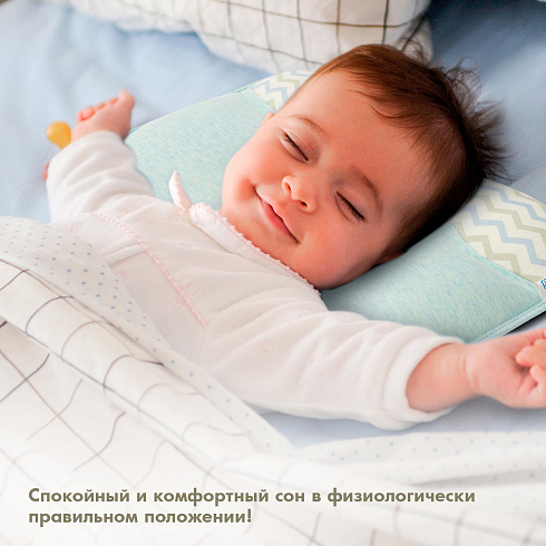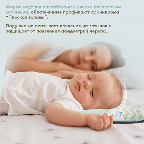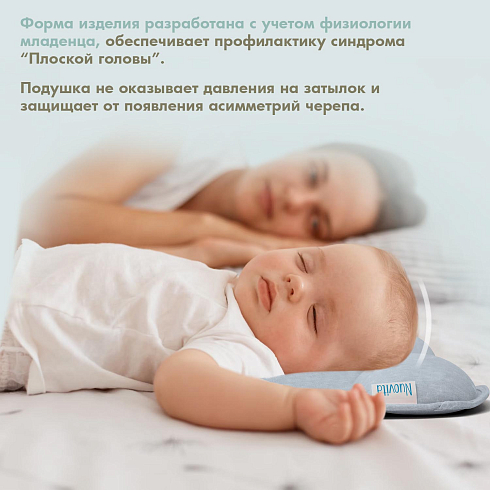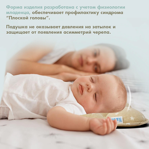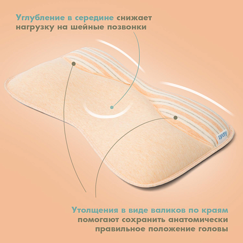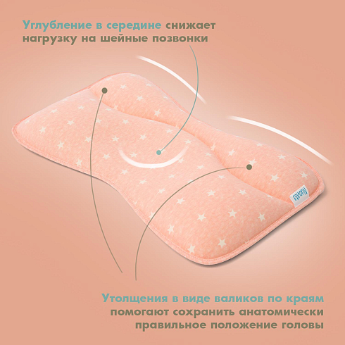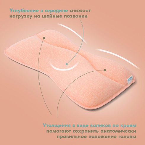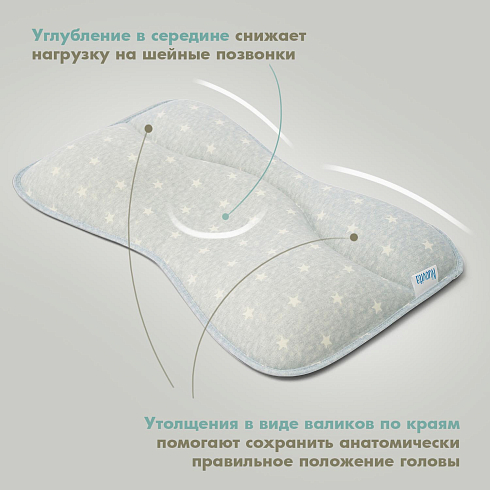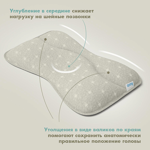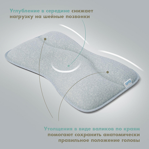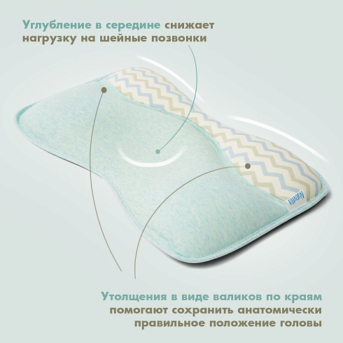 Подушка предназначена для малышей первого года жизни. Форма изделия разработана с учетом физиологии младенца и полностью соответствует особенностям его головы и позвоночника. В средней части имеется углубление, которое снижает нагрузку на шейные позвонки, а утолщения в виде валиков по краям помогают сохранить анатомически правильное положение головы.