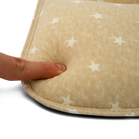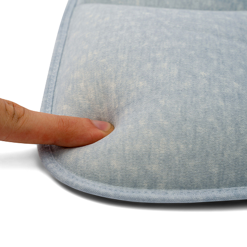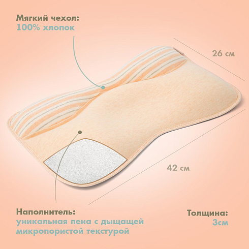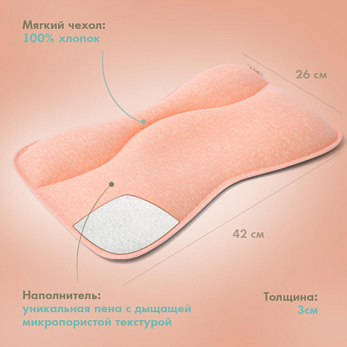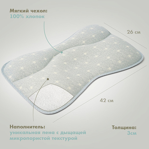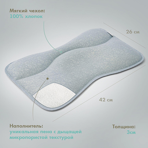 Наполнитель подушки — это уникальная пена с дышащей микропористой текстурой, эластичная и упругая. Она сертифицирована для применения в детских изделиях и обладает устойчивостью к пылевым клещам. Мягкий дышащий чехол сшит из 100% натурального хлопка.